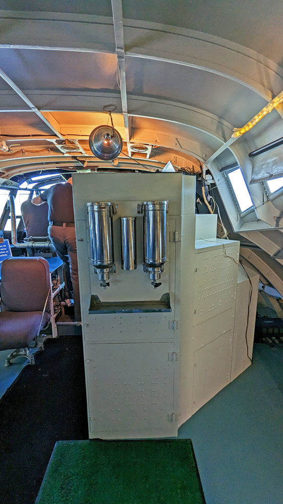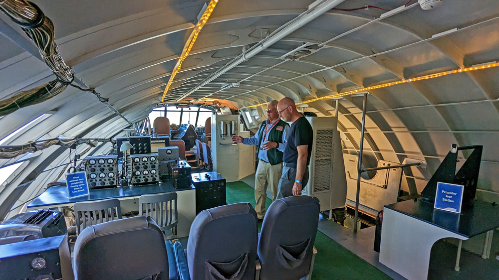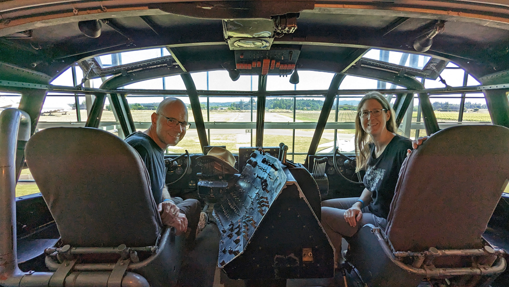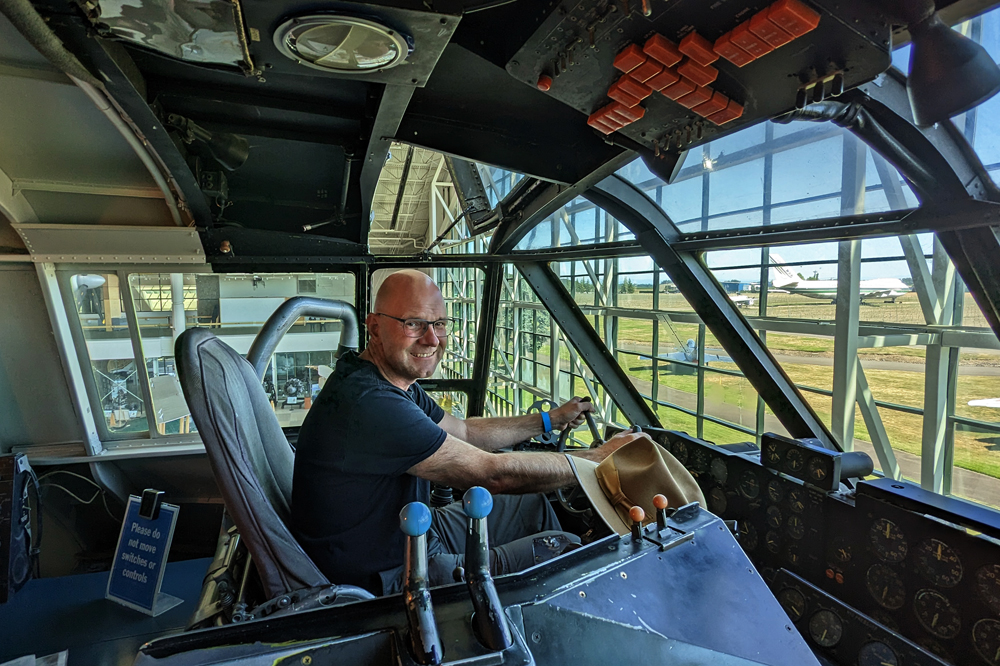 Aber zurück zur Spruce Goose! Man betritt das Museum durch ein Düsentriebwerk und dann steht man vor dem Riesending! Wir hatten ein Ticket für die behind the scenes-Tour erstanden, das für bis zu 4 Personen gilt. Da wir nur zu zweit sind, bekommen wir von einem ehemaligen Flight Controller eine interessante Privatführung. Das Highlight ist wohl der Besuch des Cockpits, wo man (Ozy) sich in den Pilotensessel setzen darf, in dem Howard Hughes beim Jungfernflug persönlich Platz genommen hatte. Die restlichen Ausstellungsstücke sind auch ganz interessant, verblassen aber ein bisschen neben dem zentralen Prunkstück (vor allem für uns Flugzeug-Laien…). Wir können (gegen 18 USD Aufpreis) auf dem Museumsparkplatz übernachten und sehen uns natürlich gleich den Film «The Aviator» über das schillernde Leben Howard Hughes’ an.