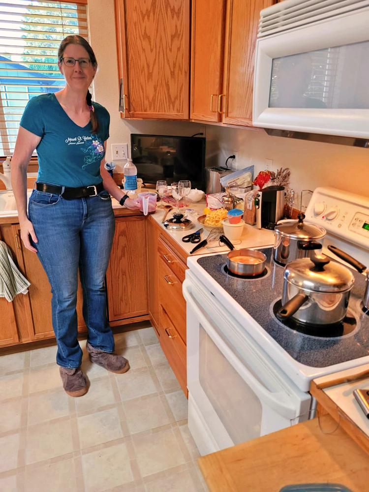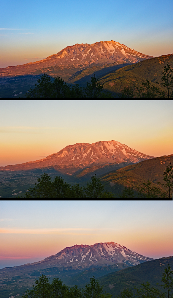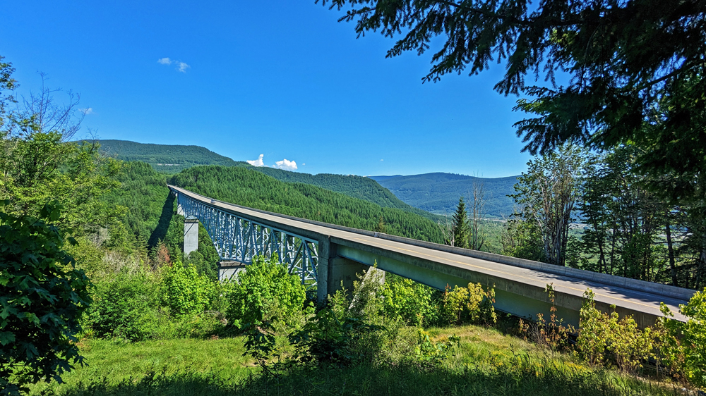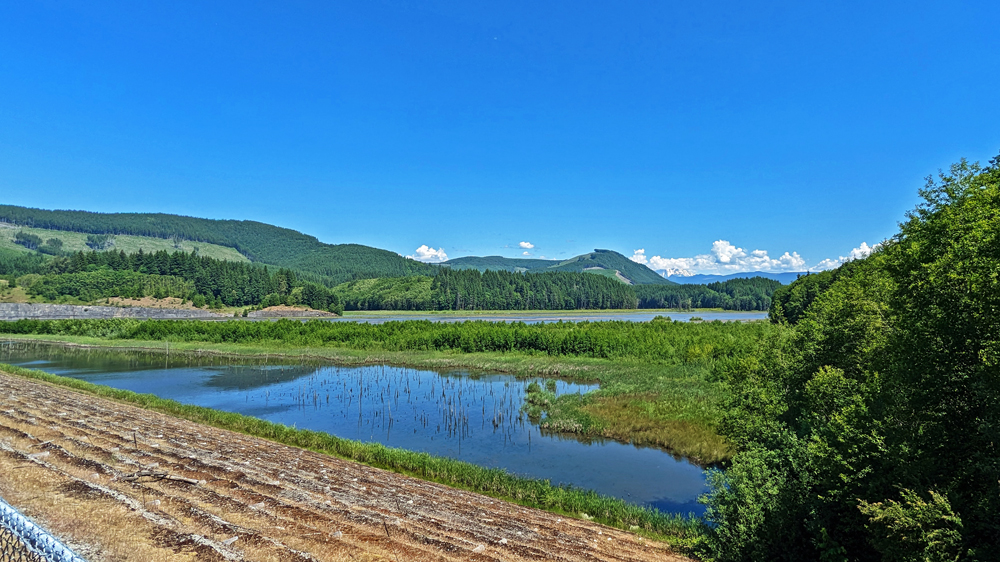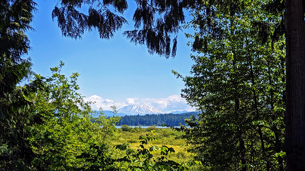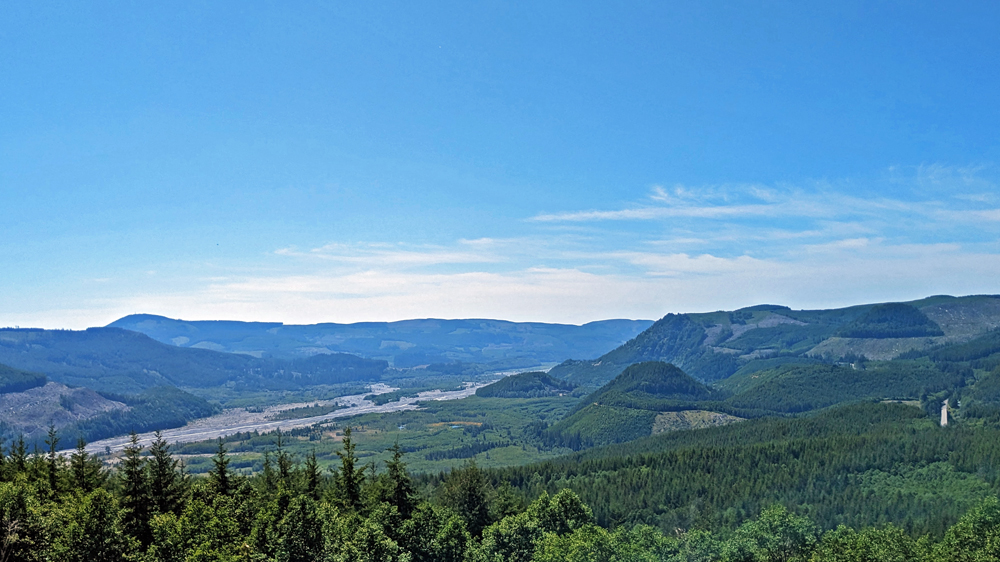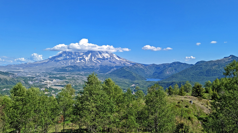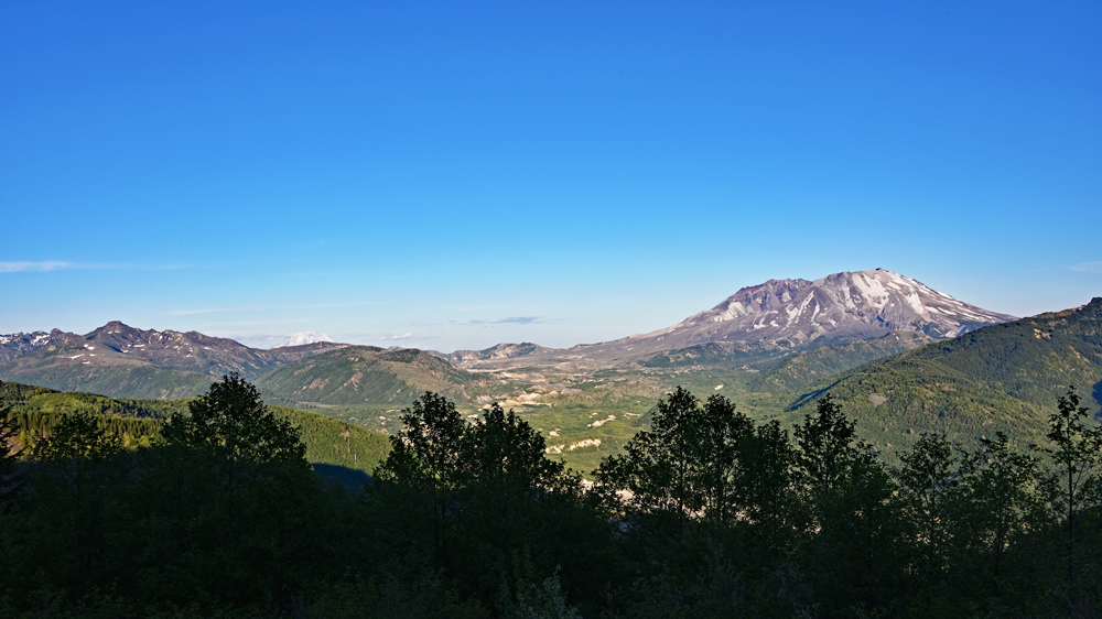 Danach besuchen wir – mit einem kurzen Abstecher zur sediment retention structure (Sediment-Rückhaltebecken) – verschiedene Aussichtspunkte. Allerdings kommen wir auch auf dieser Seite nicht ganz so nah heran wie erhofft, da das letzte Stück der Strasse zum Johnston Ridge Observatory aufgrund eines Erdrutsches gesperrt ist. Immerhin können wir an einem der Aussichtspunkte übernachten, was uns die Gelegenheit gibt, das Farbenspiel der untergehenden Sonne auf dem immer noch beeindruckenden Vulkan zu beobachten.