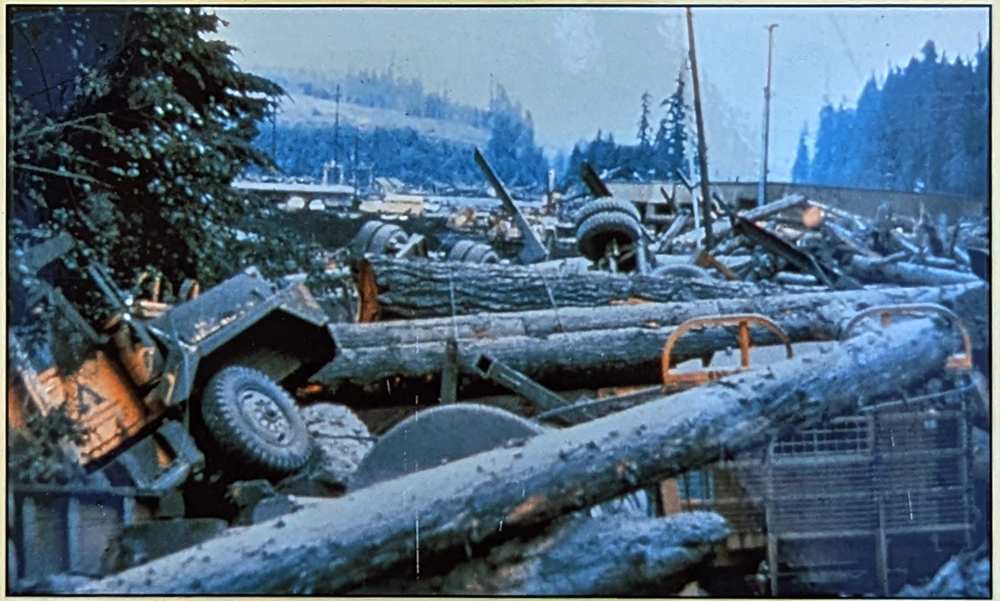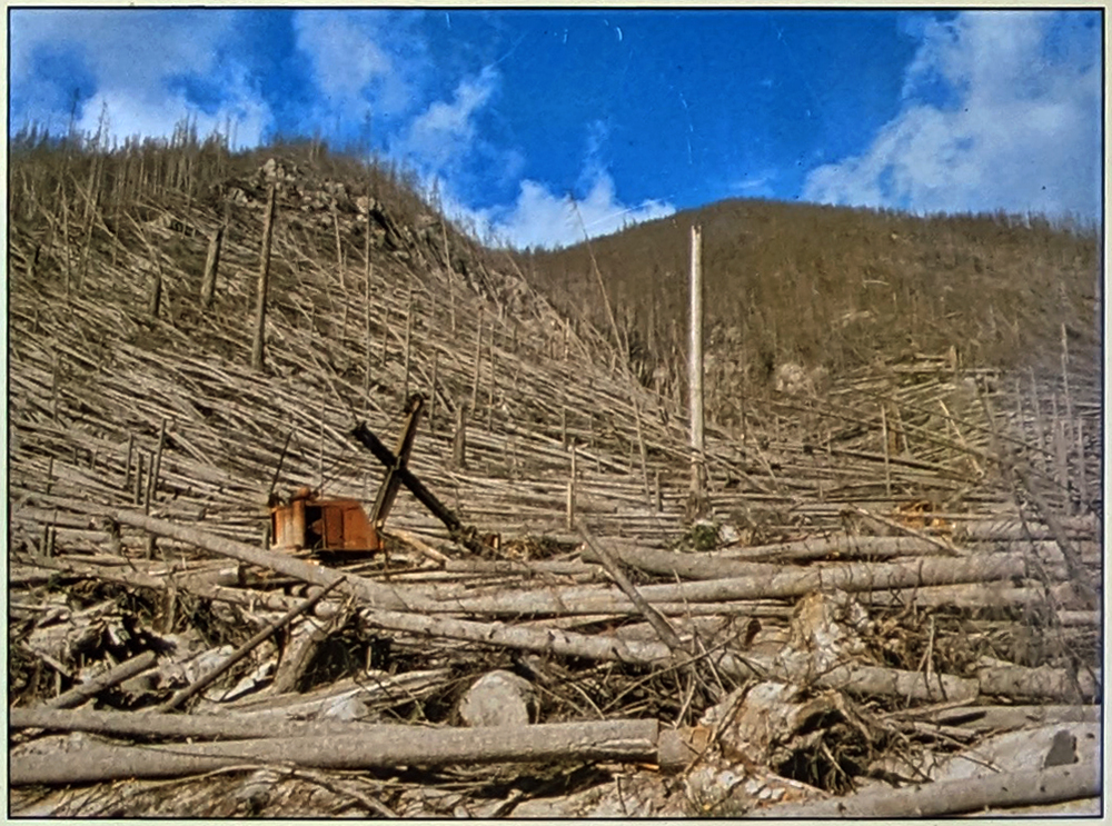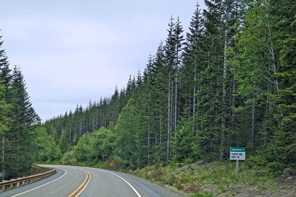 Was wir für ein Wetterglück hatten, sehen wir am nächsten Tag: unter uns ein Nebelmeer, über uns der Hochnebel. Auf dem Rückweg besuchen wir noch das Forest Learning Center über den Ausbruch und die folgende Wiederaufforstung auf der Westseite des Berges. Das Zentrum wurde von Weyerhaeuser gesponsert, einem der größten internationalen Forstwirtschaftskonzerne, dem praktisch das ganze Gebiet gehört; die Ostseite wurde ins Mt. Saint Helens National Volcanic Monument umgewandelt, wo man der Natur bzw. Wiederbewaldung ihren Lauf lässt. Über zwei Jahre wurden die von der Schockwelle umgeblasenen oder durch die heisse Luft abgestorbenen Bäume entfernt (und soweit möglich noch genutzt) und in der Folge 18,14 Millionen neue Setzlinge angepflanzt, wobei jeweils die Ascheschicht weggekratzt werden musste. Mittlerweile hat die normale Waldnutzung wieder begonnen und die ersten Bäume wurden geerntet.